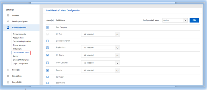 Candidate Left Menu: Admins can change the visibility for Candidate's Left Navigation Bar Menu, simply click on the edit button which enable the option to enable/disable the checkboxes. Then click on 'Save' button on the bottom to save the changes. Use the 'Reset' button to revert back to default menu.