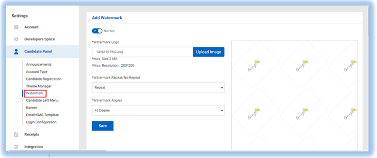 Watermark- Watermark feature lets Admin display his/her brand name on the test screen as well as on the solution report.