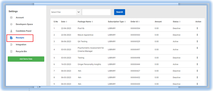 Receipts- Admin can view the receipts of those products, which have been associated with his subscription.