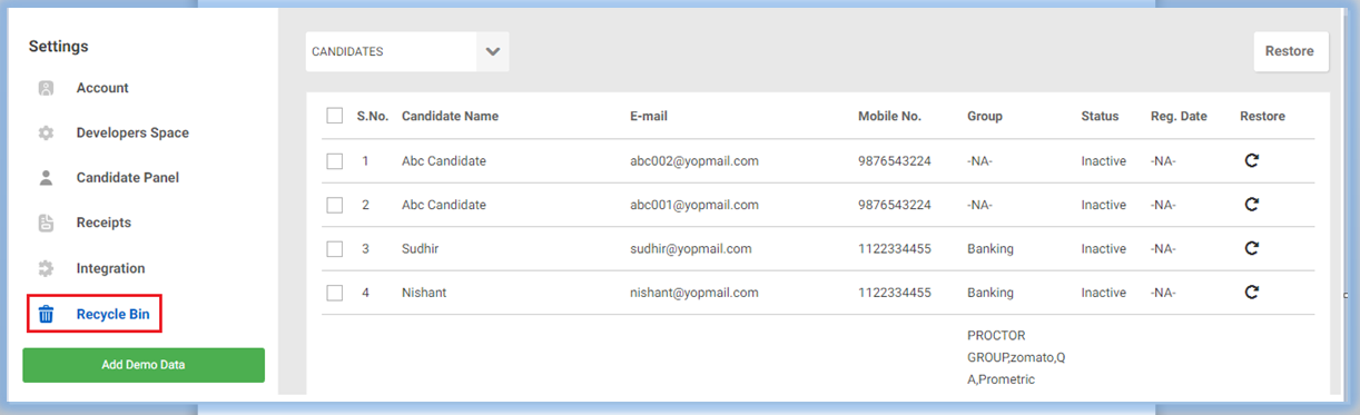 Recycle Bin- When you archive a candidate from admin panel it is not immediately removed from the panel. Instead, it is moved to the Recycle Bin, which acts as a safety net to prevent accidental data loss. From there you can restore that candidate.