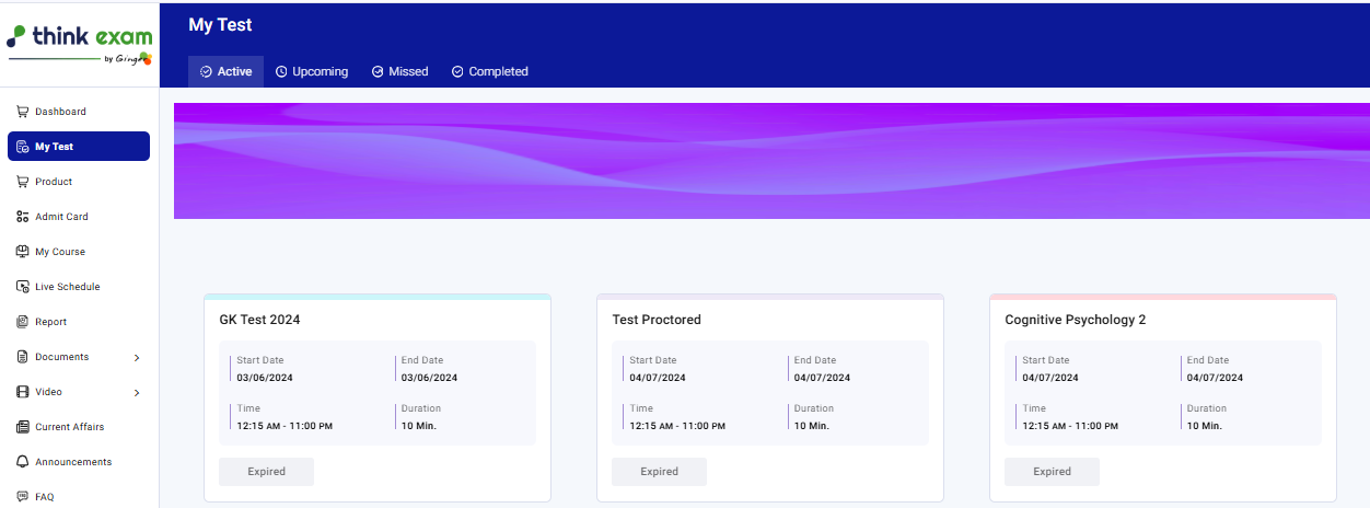 The banner will appear in the "My Test" section: