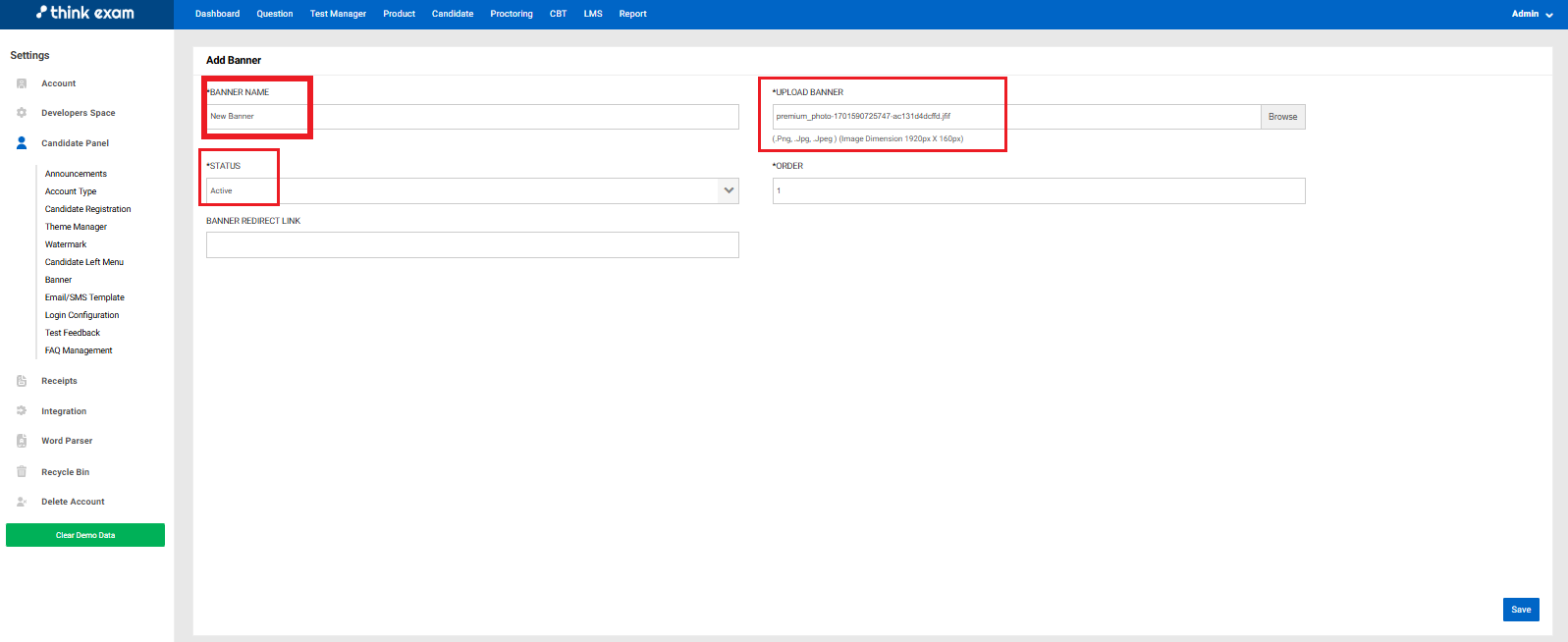 Add Banner Name, Upload Banner Image (png, .jpg, .jpeg ) (Image dimension 1920px X 160px), set the Status to 'Active', put 'Order' according to preference for the banner's priority, and Banner redirect link if you want candidate to hit a particular link if they click the banner: