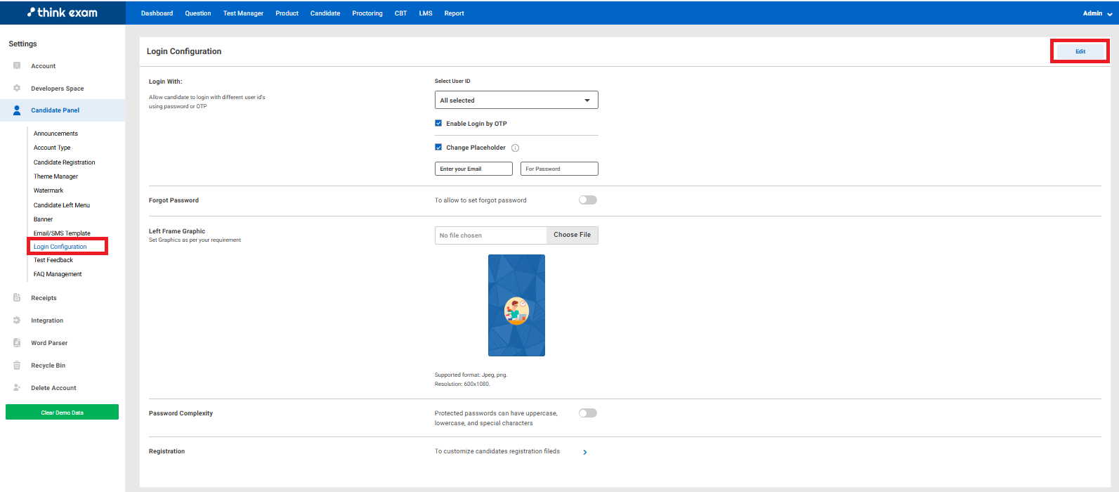 Login Configuration: This setting configures the 'Candidate Login' page using the Edit button, you can edit the Login option for candidates, whether they can login using 'Email', 'Mobile Number' or 'Enrolment Number' . Change the Placeholder name, allow candidates to reset password by enabling the switcher, change Left Frame Graphic of the login page, set Password Complexity and navigate to change Candidate's Registration(to customize registration fields like which fields to be shown to candidate when they register) fields if required