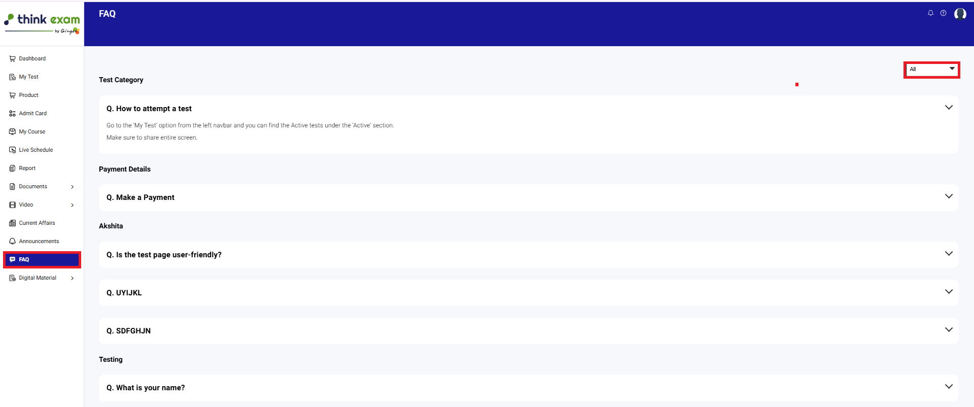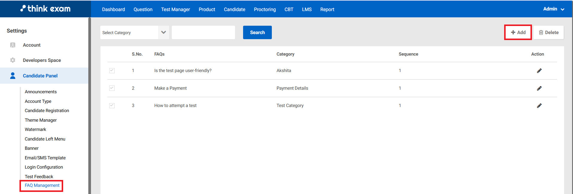 FAQ Management - In ThinkExam, FAQ Management is a feature that allows the admin to create and manage a list of Frequently Asked Questions for candidates or users.