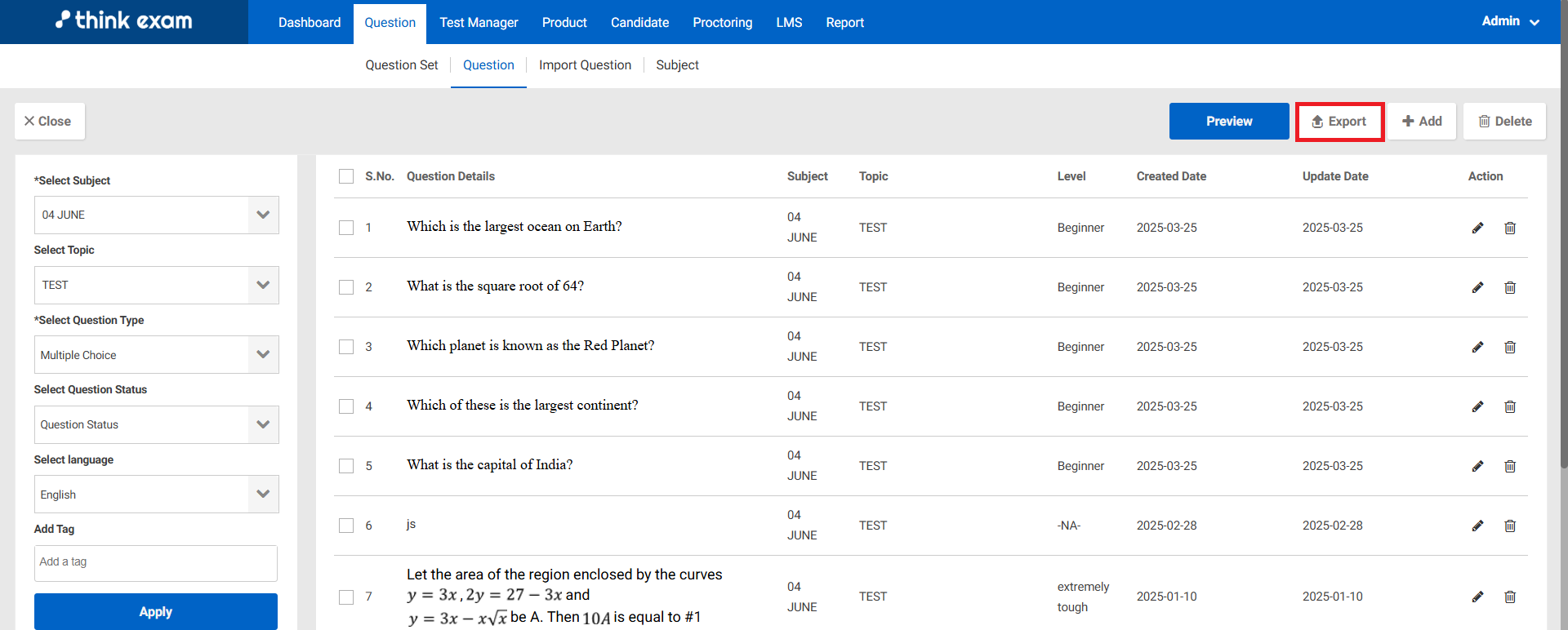 Yes, ThinkExam provides admins with the option to export questions from the Admin Panel. Please follow the steps below to export the questions: