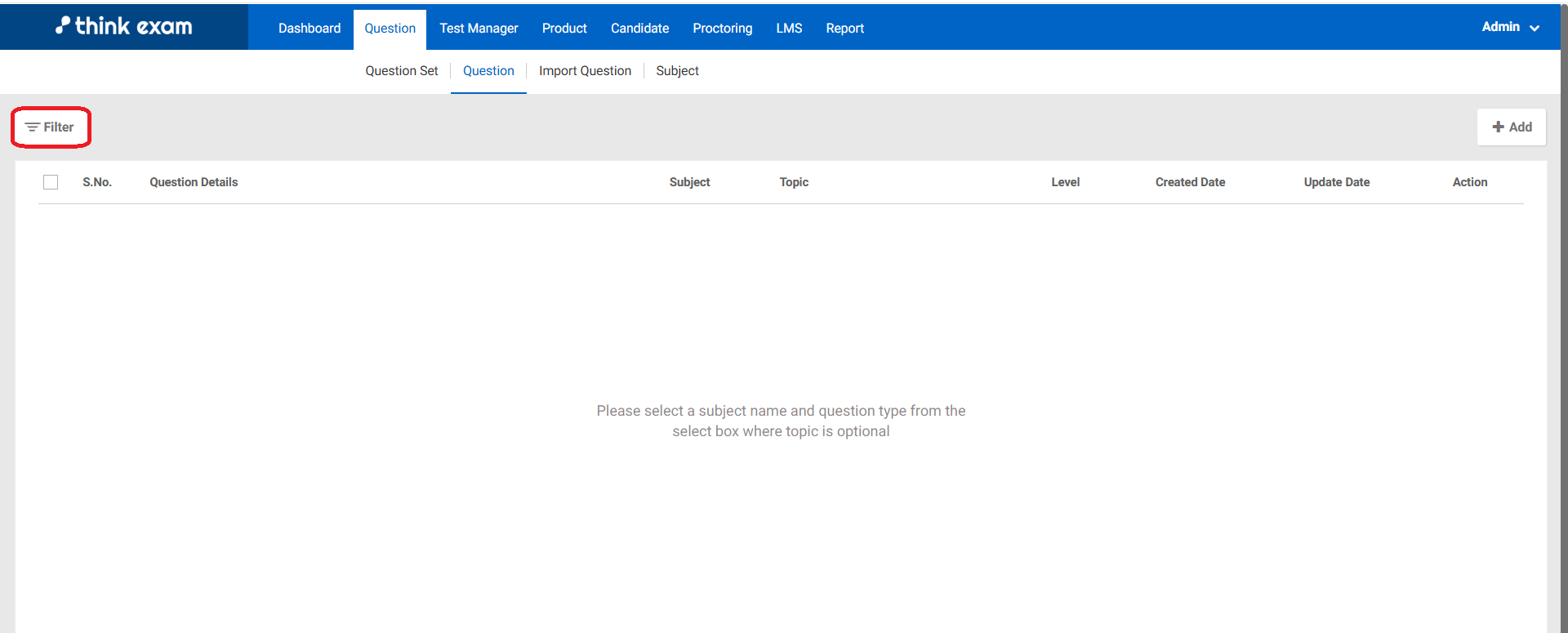 Step 2: Click on the Filter button to apply filters—primarily to select the subject and topics for which the admin wants to export questions.