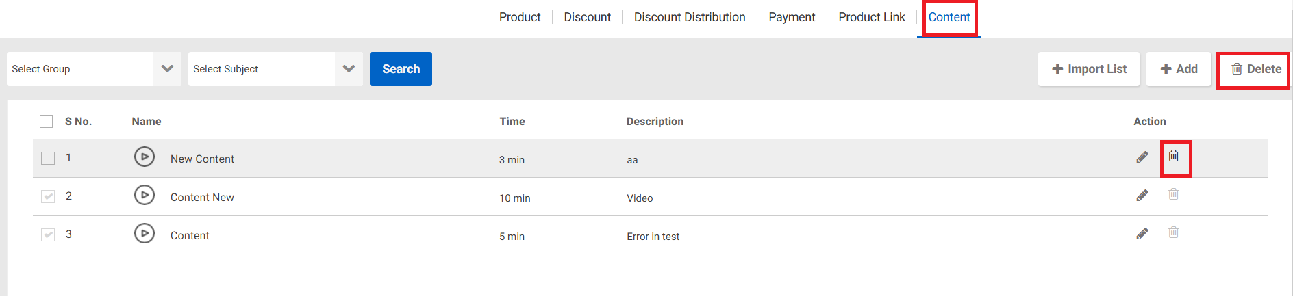Yes, you may delete the content, but please ensure it is not associated with any product. To delete the content, go to the Content section under the Product tab, select the content you wish to delete, and then click the Delete button or the trash icon on the right-hand side of the desired product.