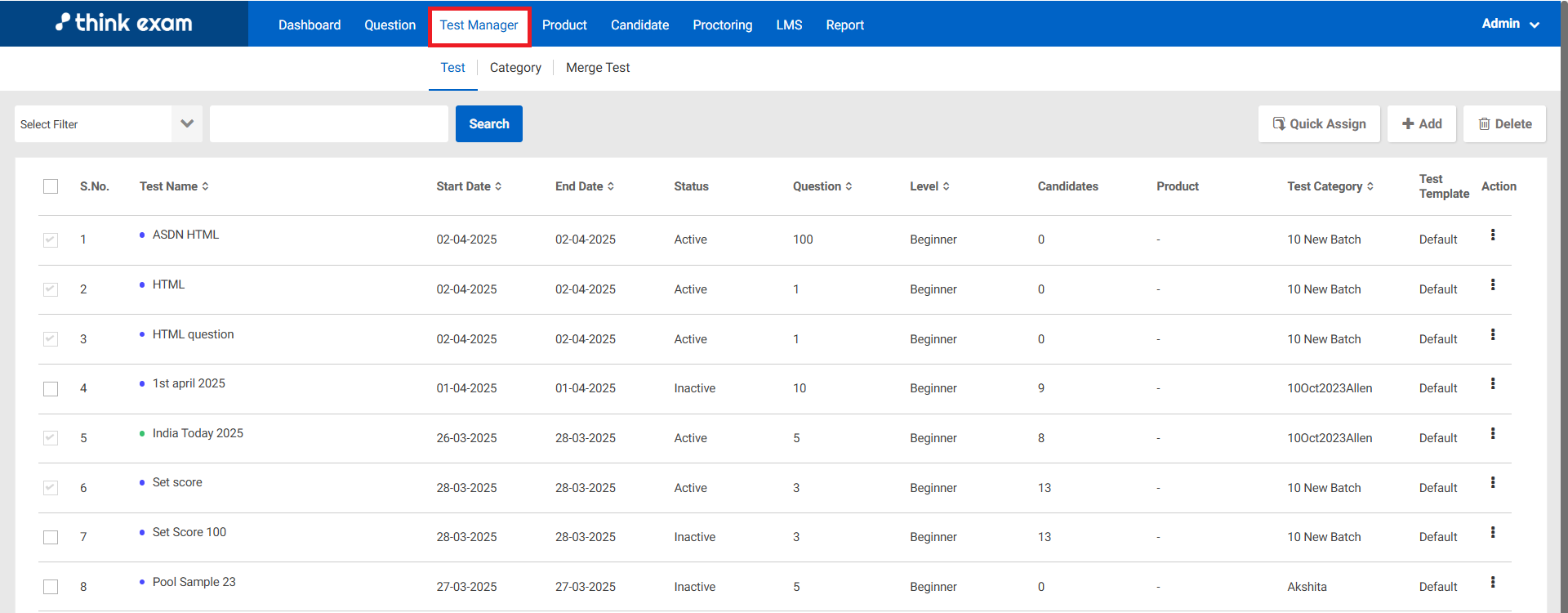 Log in to the Admin Panel and navigate to the Test Manager module.
