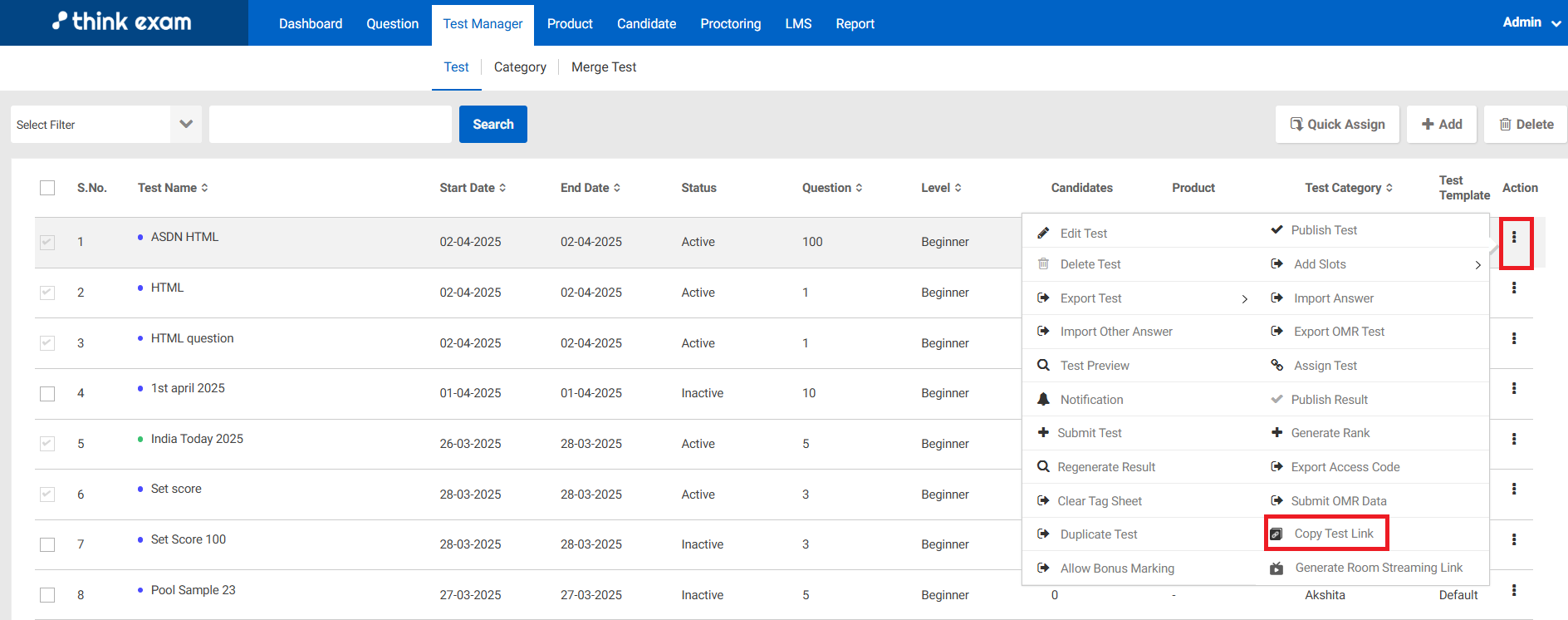 2. Click on the three dots next to the test name under the Action button and select Copy Test Link.