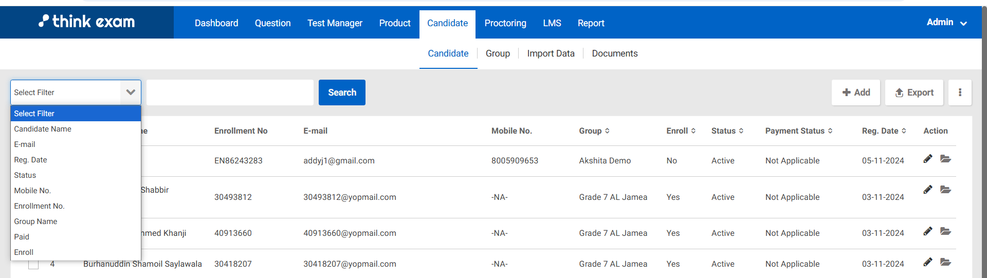 You can search for candidates using the search bar at the top of the Candidate tab. Enter the candidate’s name, email, enrollment number or other identifiers to quickly locate them.