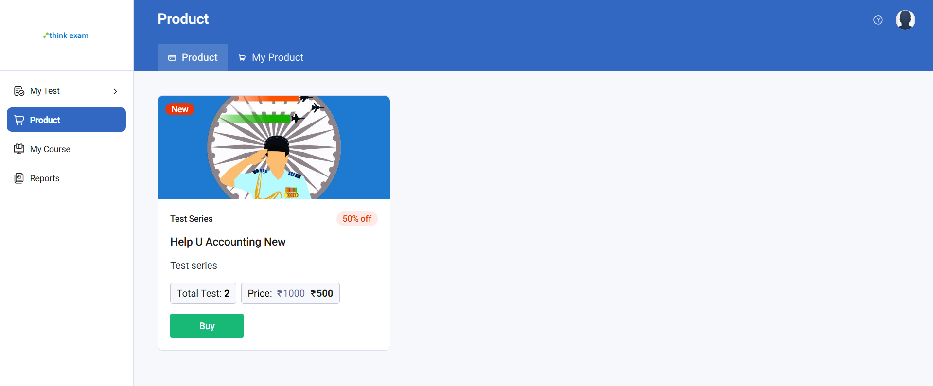 Once a product is created and published, it becomes visible to candidates on their panel. Candidates can view details, make a purchase, and access the tests or course content included in the product.