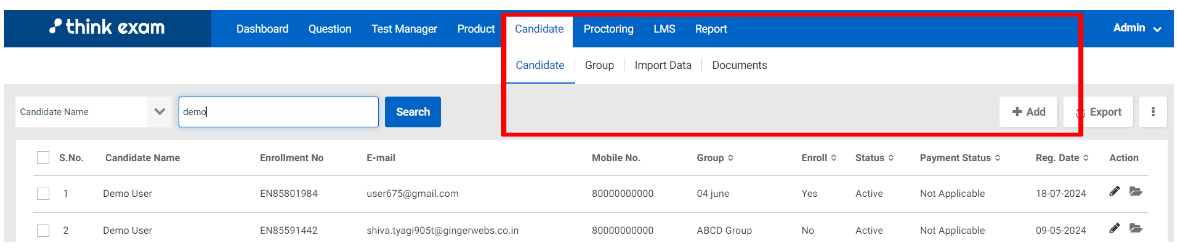 - Now add the candidate’s email ID, Password, Name, Mobile number, Date of registration and select the group from the dropdown.