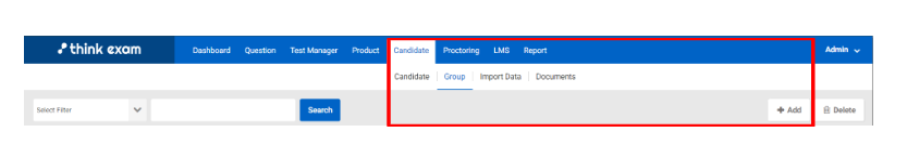 The “Candidate” Tab allows you to add candidates either manually or you can import via an excel upload. You can create different groups and you can also associate candidates with each group. You can search for any candidate by first selecting a criteria or search filter such as Candidate name, email, enrollment number etc.