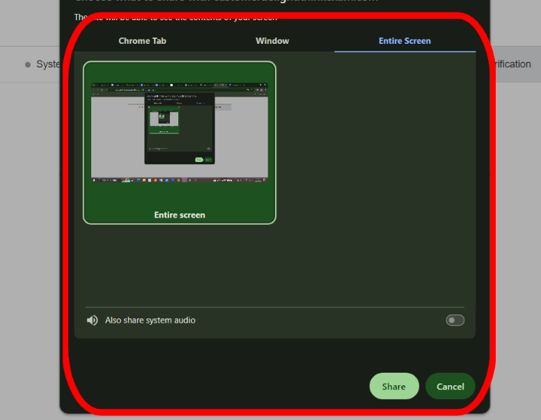 The system will prompt you to share your screen again. Repeat the same steps: select the entire screen, check the box, and click "Share".