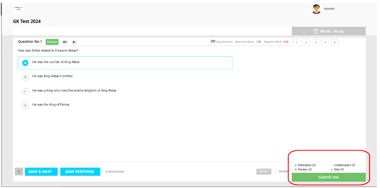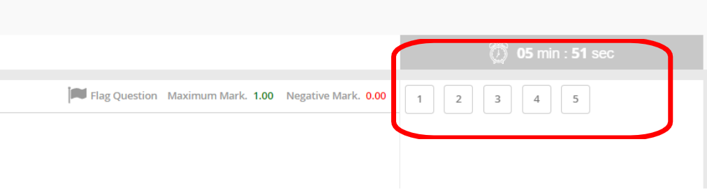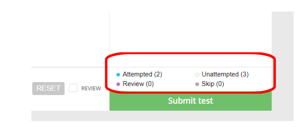This section located above the submit test button will display the attempted, skipped and un attempted question count.