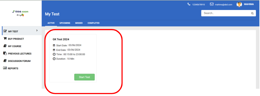 After logging in, in the “Active” tab you will find the test which you need to attempt. ( In case no test(s) are visible in the active tab, please check “upcoming” and “missed” tabs as well). Now click on the “Start Test” button to begin the test.