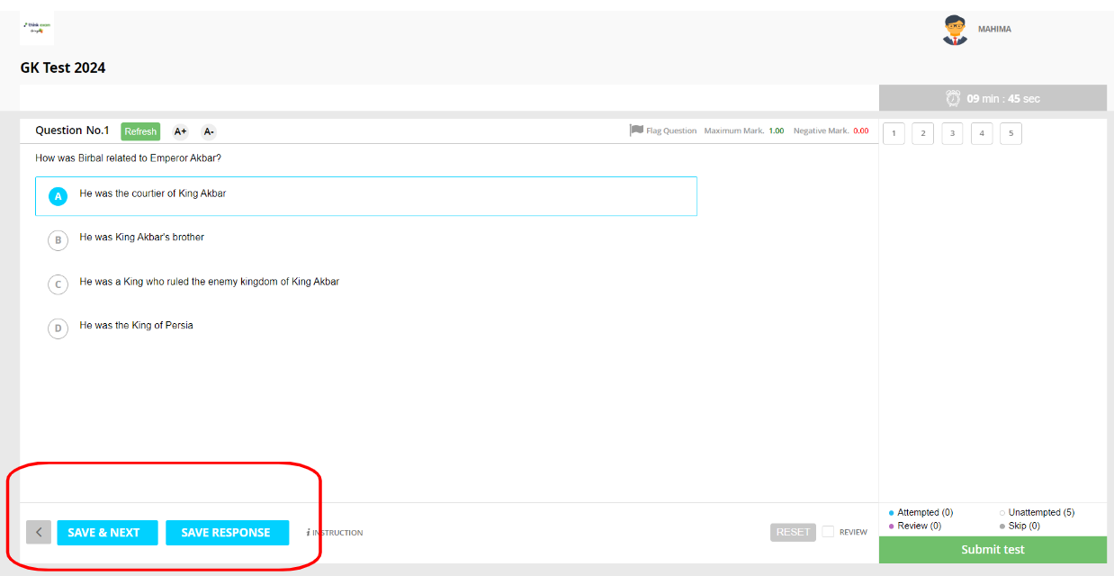 You can use the “Reset” button to reset your saved responses. In case you want to review any particular question, Click on the check box in front of the “Review” button.