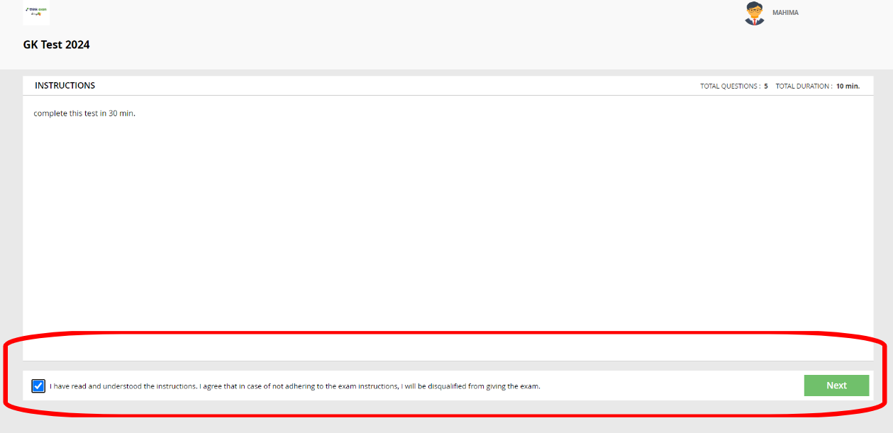 After the system check is completed, the instructions page will open up. Read out the test instructions carefully and then click on the check box located on the bottom left corner. Now, click on the “Next” button.