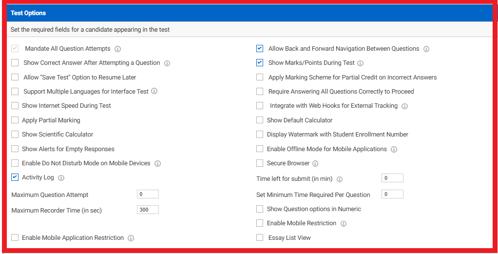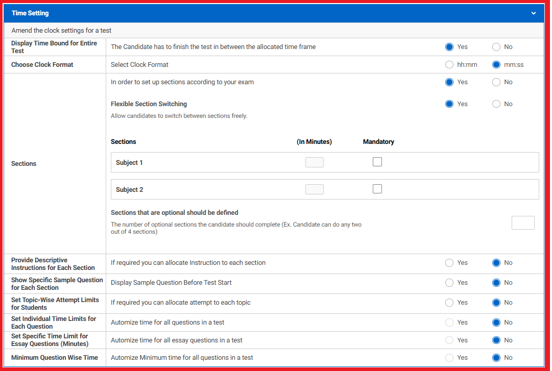 Sections: If you have added sections to your test, this setting will allow you to define the time limit for the candidate to complete each section. However the Flexible Section Switching option allows candidates to switch between sections freely. You can further make any section mandatory to attempt.