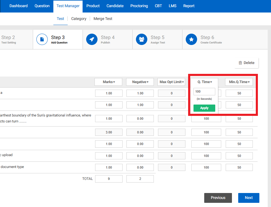 Note: To set up Sections, Questions should added in 'Step 3: Add Question' section. There are settings which needs to be disabled to enable another settings as they are contradictory. For example, if Section is enabled, then we cannot enable the Individual Time Limits for Questions. When Time Limit settings are enabled, 'Q.Time' , 'E.Q Time' and 'Min. Q. Time' feature will be visible in 'Step 3: Add Question' section to assign the timing to the questions as shared in the given screenshot.