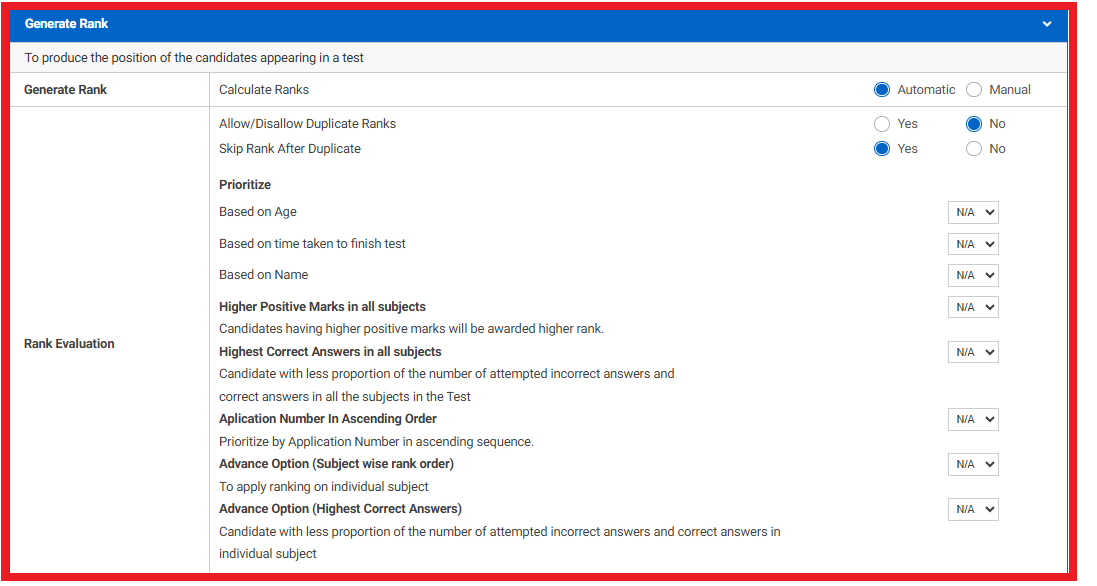 Rank Evaluation - Allow/Disallow Duplicate Ranks: This determines whether candidates can have the same rank if they achieve identical scores. If set as "Yes", candidates with the same score may share a rank. If set as "No", each candidate will have a unique rank, even if their scores are the same.