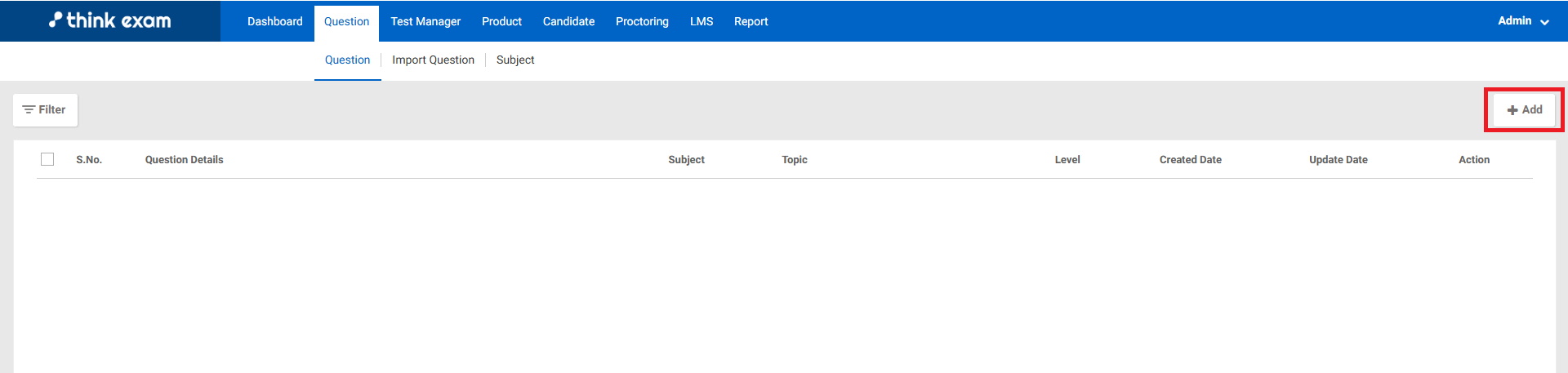 1.To add questions, navigate to the Question Tab and select "Question." Then, click on the "Add" button located on the right-hand side.