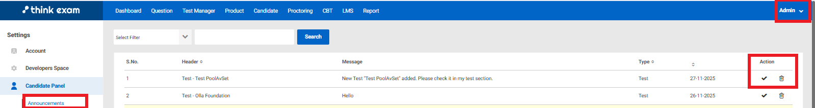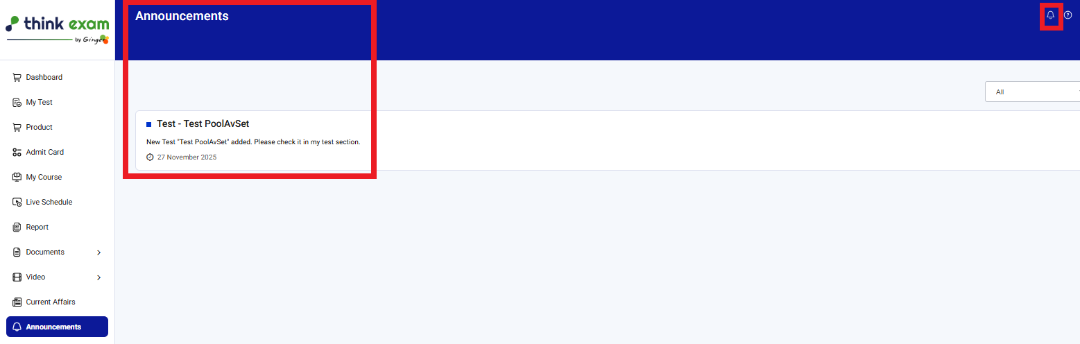 The Notifications will be shown under 'Announcement' section for the Candidates and the bell icon when a new test is published: