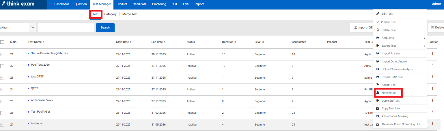 You can notify candidates through the Announcement section in the Candidate Portal and the bell icon, so they can easily see which new tests have been added.