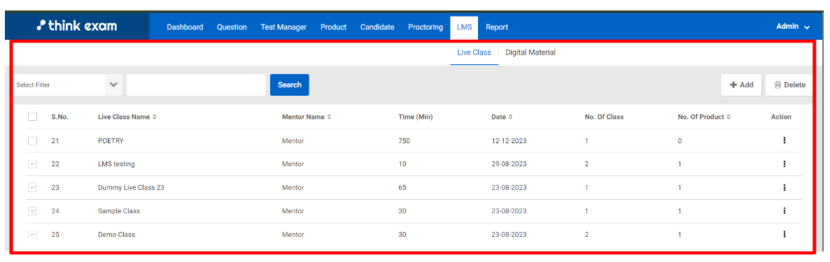 The LMS module allows you to schedule live classes and share digital materials with candidates.