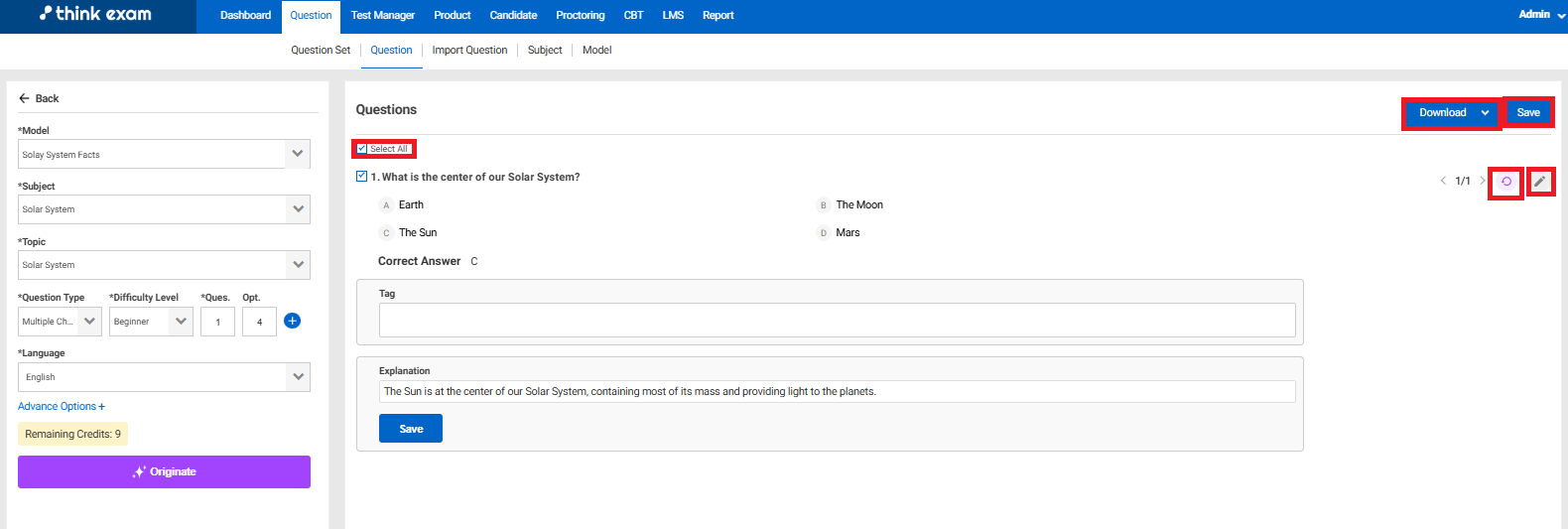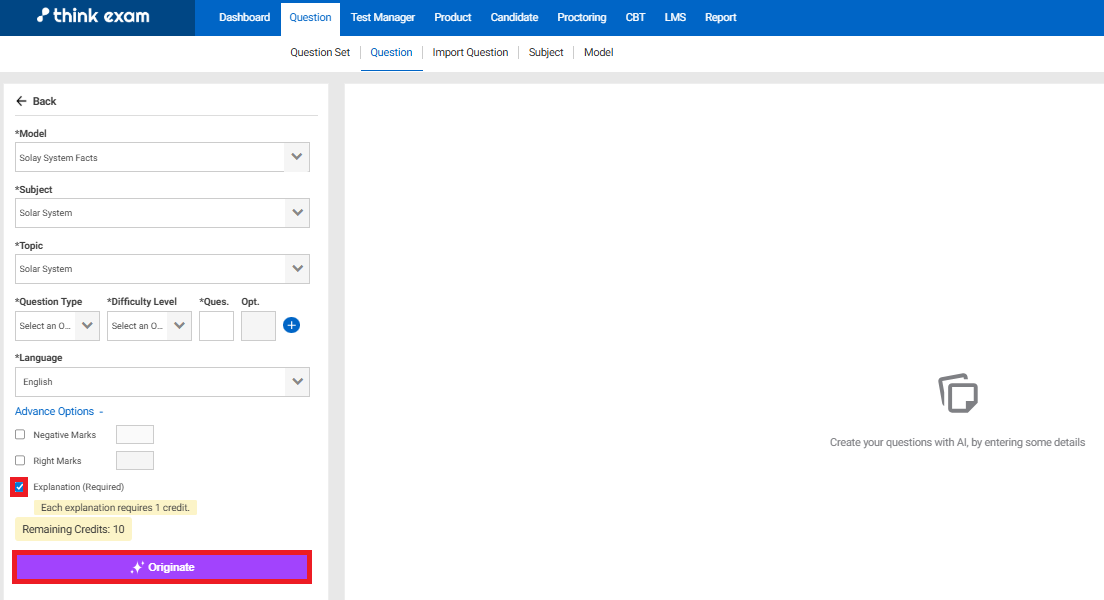 Step 3: Add necessary details in the Originate Page, like Model, Subject, Topic. These information should be similar to each other as AI generates question considering the model, subject and topic. Add Question Type (Multiple Choice, True/False, Fill in the Blanks, Short Answer), Difficulty level of question(s) to be generated, Number of questions(Ques.) and number of Options (Opt.) in case of Multiple Choice questions. Select Preferred Language and click on 'Advance Options' if needed. There, we can add Negative Marks, Right Marks and Option Marks. We can also check the 'Explanation(Required)' configuration as this creates the explanation of the question generated please note that each explanation requires 1 more credit to be consumed, then click on 'Originate':