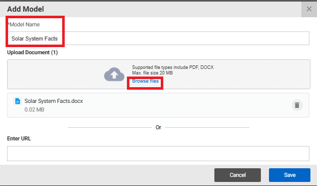 The document format supported are of types PDF and DOCX and the maximum file size is 20 MB. We can edit and delete the previously generated models as well.