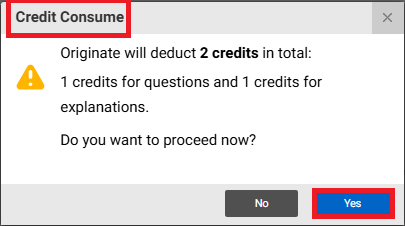 Step 4: Credit Consumption dialog box will appear showing how many credits will be deducted from the Originate count. Click Yes to Proceed: