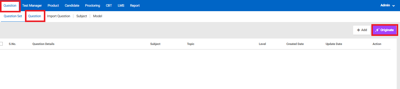 Originate button can help admin create questions using a Model which is a document that can be uploaded with some content or information. Using Artificial Intelligence or AI, our Panel automatically generates questions based on the document Model.