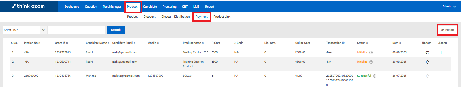 Payments made or initiated by the candidates can be viewed through Product-> Payment subsection. You can export the details in excel format.