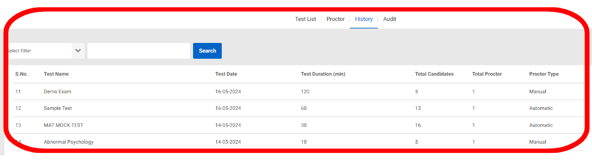 Under this tab, you will find the list of tests where candidates have attempted and completed the test. By selecting a specific test, admins can access details of the candidate's session, UFMs, and session video.